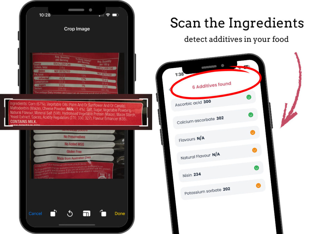 Inside the app, you can scan the ingredients listing, and itβll detect any additives! It will then tell you how theyβre made, what they are linked to and rate them from safe to risky.