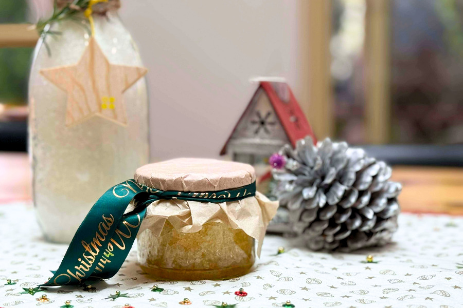 This Cacao Butter Foot & Body Polish is a deliciously rich scrub–soak combo that leaves skin soft, smooth, and totally pampered. The Epsom salts gently exfoliate while the warm, chocolatey cacao butter melts into the skin for deep nourishment. Perfect for tired feet, dry legs, or anyone in need of a little indulgence, it’s an easy, luxurious DIY gift that feels like a spa day in a jar.